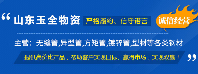 山東玉全物資有限公司主要銷售無縫管,異型管,方矩管,鍍鋅管,型材、鋼管切割加工等系列產品。我公司已與眾多大型原材料廠建立了長期合作共贏的關系,為客戶提供充足的貨源。 公司主要從事管材的銷售,產品有涉及:無縫管,異型管,方矩管,鍍鋅管,型材、鋼管切割加工等。產品廣泛用于化工、電廠、建筑工地、城市建設、汽車等行業。客戶覆蓋了國內24個省、市、自治區;并遠銷香港、臺灣、日本、韓國、澳大利亞、菲律賓、新加坡、埃及、伊拉克等20多個國家和地區。憑借優質的產品和服務,深受國內外客戶的信任和好評。…